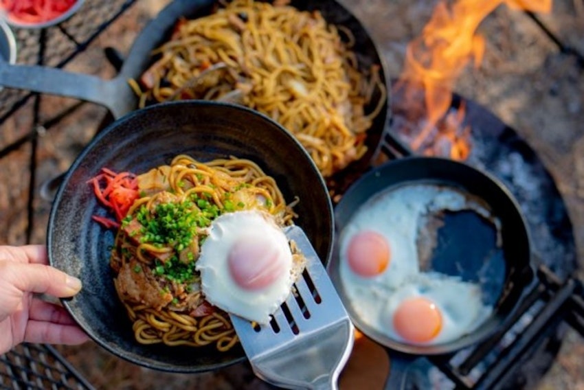 焚き火で作ると火力が強いので麺や豚肉の焦げつきに注意が必要ですが、アウトドア感がグッとアップします!また、かつお粉を入れると屋台風な感じになっておいしいです。